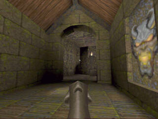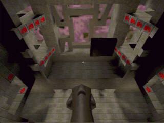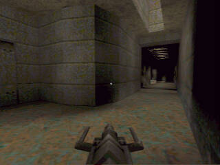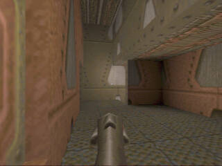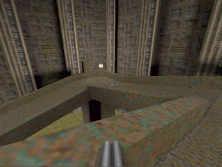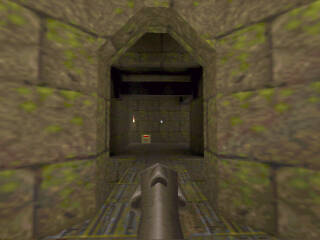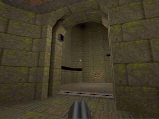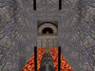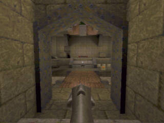 | I had just had a battle with "Ferox" in the rocket launcher room. I barely escaped getting killed by going up the elevator to the corridor. I was rather low on health, so I thought I'd try to fool him a bit. Instead of running to the other end of the corridor, I moved to the corner just to the right of the elevator. He fired rockets up into the corridor, but since he thought I was running away, he was aiming for the farther end, and the rockets flew just past me. (Phew!) I waited a bit, hoping he would go after me, and he did! He walked right past me, and I (literally) fried his ass with the lightning gun... |